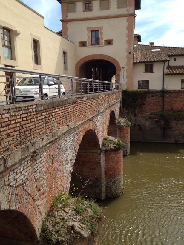 We had a long uphill stretch across a very sandy ground with tough low vegetation before coming to Ponte a Cappiano with an interesting bridge across the Usciana canal .