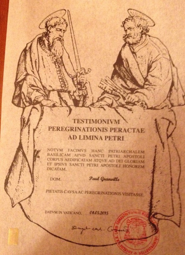The office that issues pilgrim testimoniums or certificates is inside the church. There were touts making offers of ‘skip the line ‘, I guess with others standing in the queue ready to give you their place. However luckily us pilgrims have a special way of accessing the interior of Saint Peter’s. Around the left side of the church is a big steel gate. Firstly you go through the metal detectors operated by the Italian State Police. Then you get checked by the Swiss Guards.