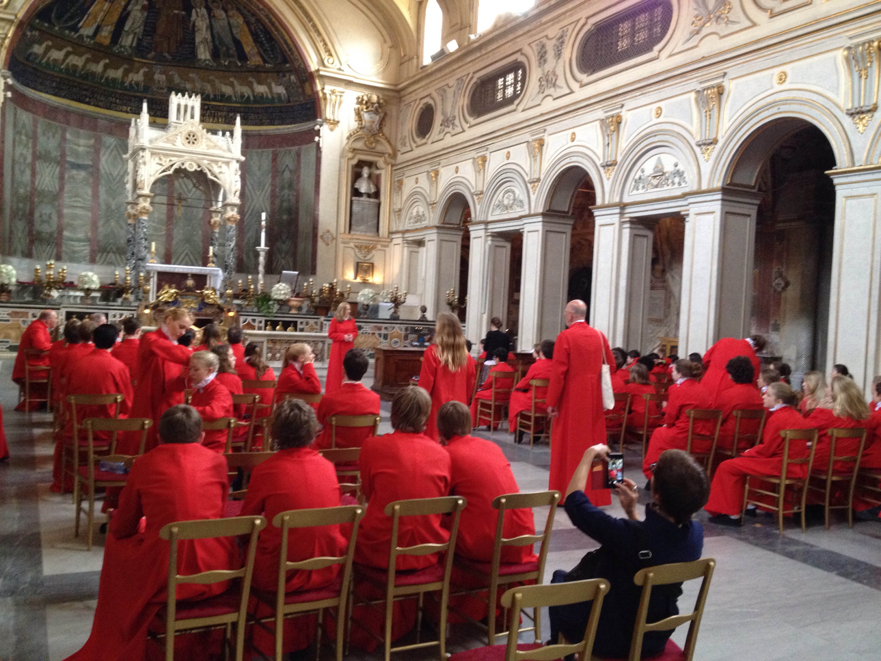 We managed to fit in a visit to a few of the major basilicas that pilgrims would of visited. I’ve been wearing sandals and my feet have largely recovered – just one big blister left to heal. Firstly I took Cathy to visit Saint Cecilia’s where I had stayed in the pilgrims’ hostel the day before. A large group of foreign kids poured in wearing skimpy shorts and sat down. We thought it was a school group. An elderly nun in the church was extremely upset by the inappropriate dress and Cathy mentioned this to one of the adults and they all trooped out. Then they all started coming back in again wearing red robes ! It turned out they were the cathedral choir from Haarlem and had come to rehearse for a concert that night.