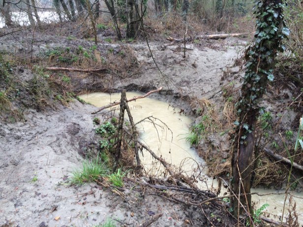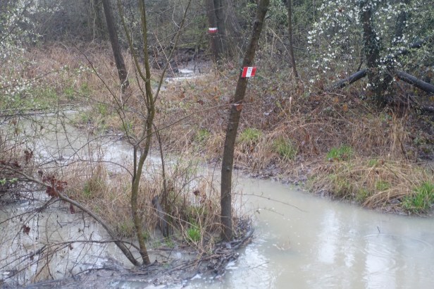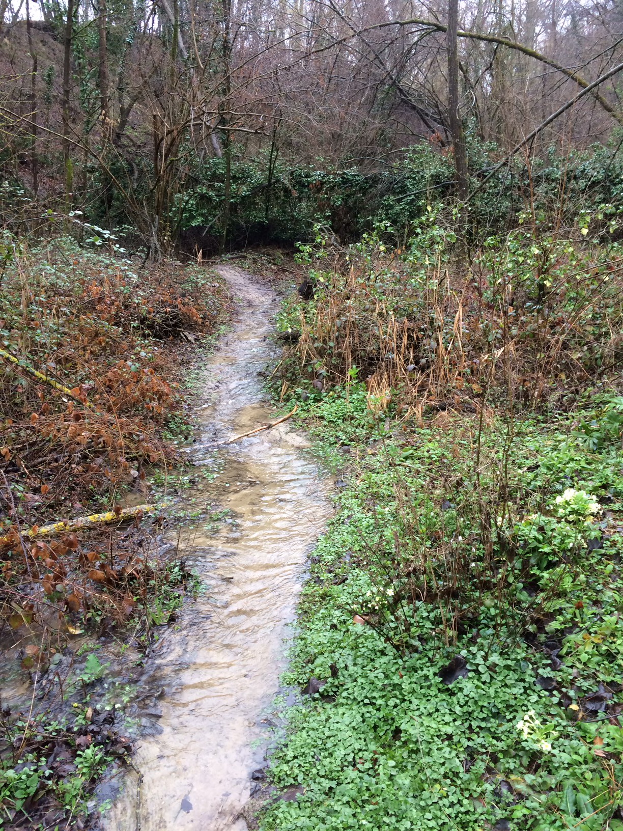Things then slowly started going downhill. The path got more and more soggy and muddy until I finally arrived at a small stream. I couldn’t find anyway around it so I had to walk straight across. The water was unexpectedly deep and came up to my knees. I now had water in my shoes which was quite cold, as it was a 5 degree day. Every time I thought I’d passed the worse, a greater challenge presented itself. For example, here I had a steep descent of around 3 metres down a muddy slope, a rushing stream too wide to jump, then a steep ascent up a slippery muddy slope.