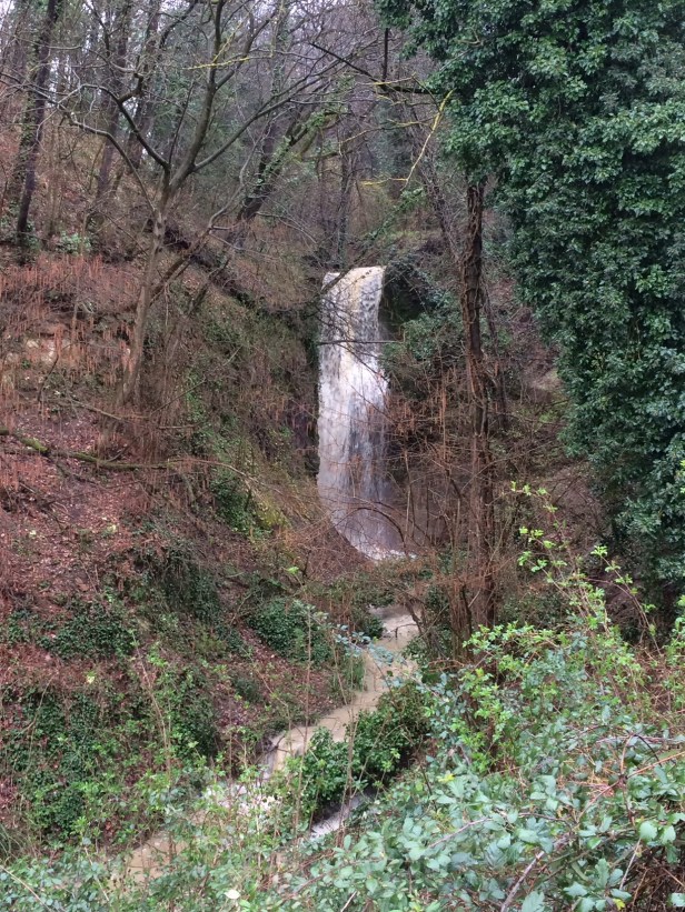 My walk along the Via degli Dei is still a few weeks off, but I thought I’d explore part of the first day’s walk along the valley of the Reno river. I decided to take a train up to Sasso Marconi and walk the 15 km back to Bologna. Things started off OK with a pleasant climb in light rain, passing a waterfall.