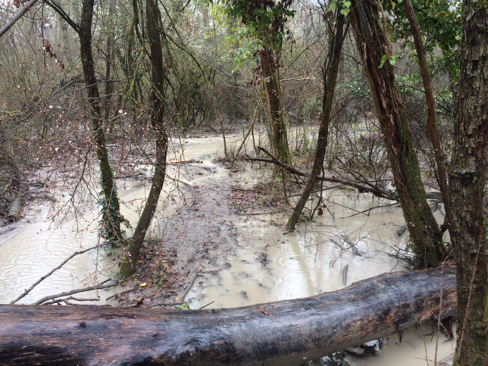 I was getting constantly scratched by the thorny vines as I tried to avoid deep running water and slippery mud. There were a lot of  fallen trees to scramble across. At least the ‘path’ was well marked with the Club Alpino Italiano red and white signs!