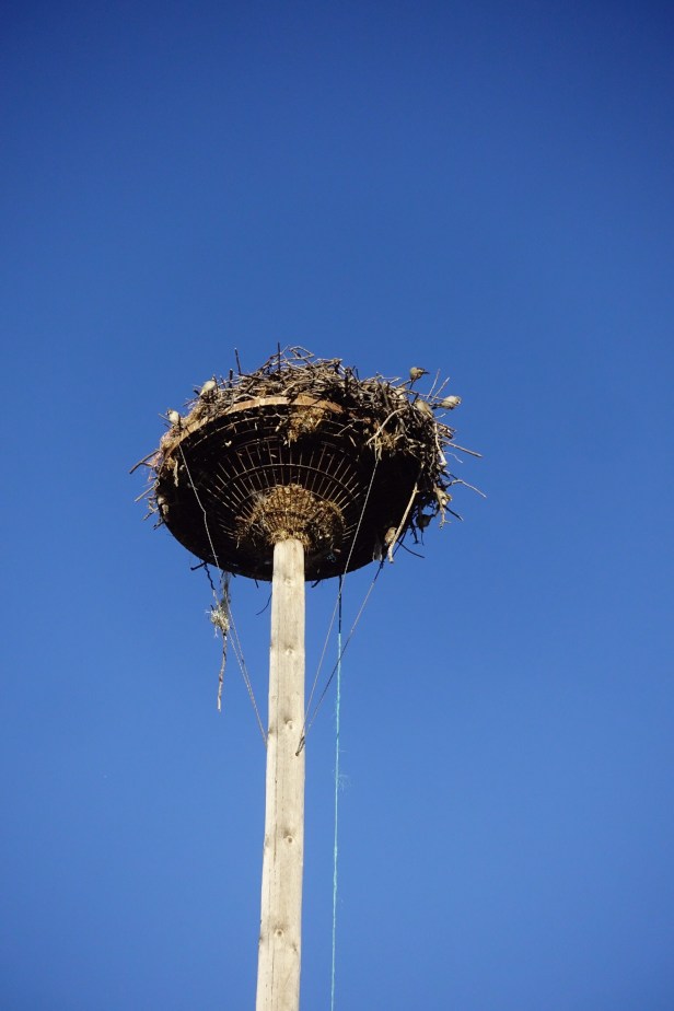 In this area there are lots of poles put up to allow birds to make nests. I think these are stork nests which are very heavy and can stay in use for centuries. However smaller birds were using the nests as well. I’ve seen lots of stork nests on churches