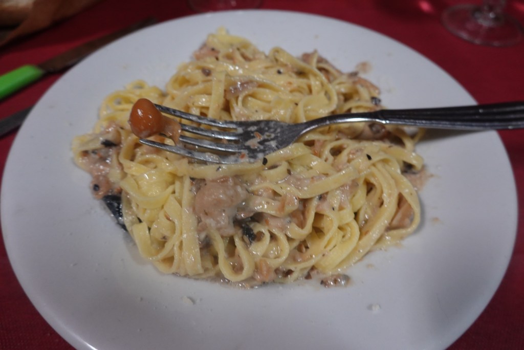 I chose from the verbal menu fettuccine with fresh mushrooms, a pork chop with cicoria and tiramisù. Of course they brought me an espresso coffee without my having to ask . All up €20 ($AU32)