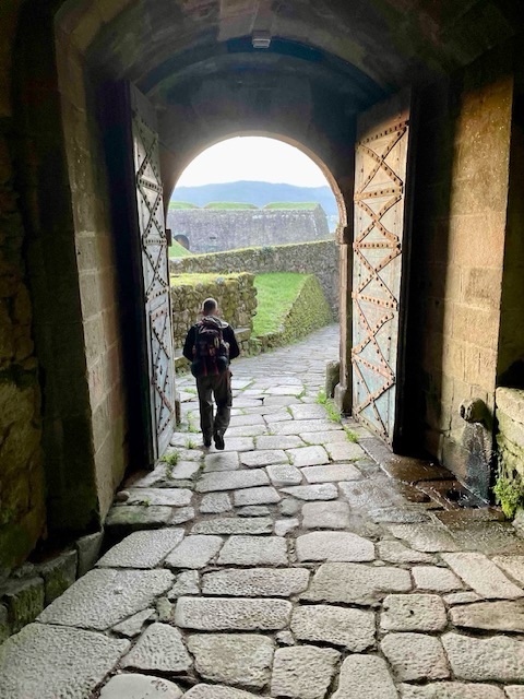 The path climbs up through the town of Tui, with its impressive cathedral portal .